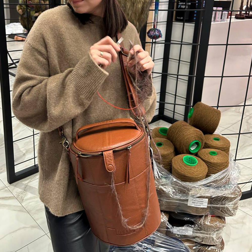 Сумка цилиндрической формы, с тщательно продуманными деталями, с ней вы сможете легко брать свои творческие проекты. В размер XL свободно поместятся бобина пряжи около 500 г, все необходимые для текущего проекта инструменты и сам проект на любой стадии его готовности. Сумка имеет внешние и внутренние карманы, куда поместится большинство ваших аксессуаров для вязания. Два отверстия сверху позволяют оставить пряжу в сумке, а нити вывести наружу во время вязания и избежать спутывания нитей.