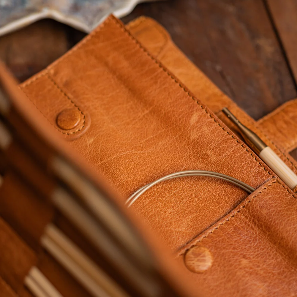 Красивый кожаный органайзер для спиц, крючков, тросов и полезных мелких принадлежностей.