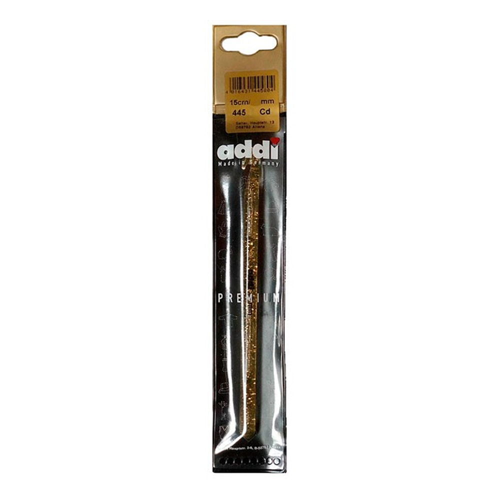 Крючок Addi 445-7 изготовлен из прозрачного пластика с добавлением золотистых частиц.