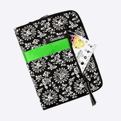 Набор упакован в компактном тканевом органайзере на молнии. Размер в сложенном виде: 15см х 20см. Сумочка украшена своеобразной кодировкой – лентой зеленого цвета, которая означает, что в наборе именно бамбуковые спицы. В органайзере предусмотрены свободные слоты, так что в любой момент можно дополнить свой инструментарий другими парами спиц.