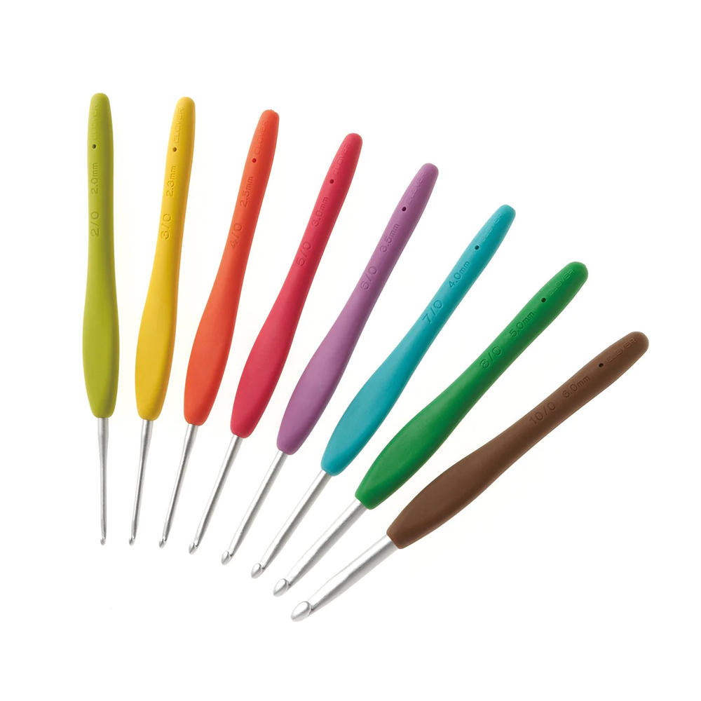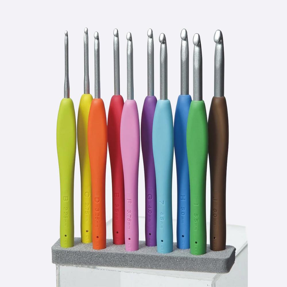 Крючки имеют эргономичные ручки ярких разных цветов, цвета также являются маркировкой для быстрого определения размера.