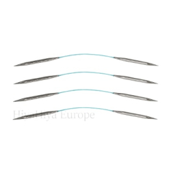 Каждая спица длиной 15 см состоит из пары спиц по 7,5 см каждая и гибкой лески длиной 5 см. Этот дизайн обеспечивает удобство при вязании небольших изделий, таких как носки или рукава, делая процесс более быстрым и комфортным.