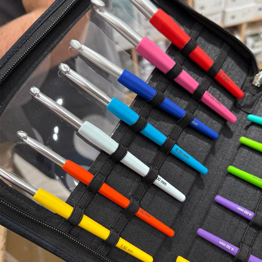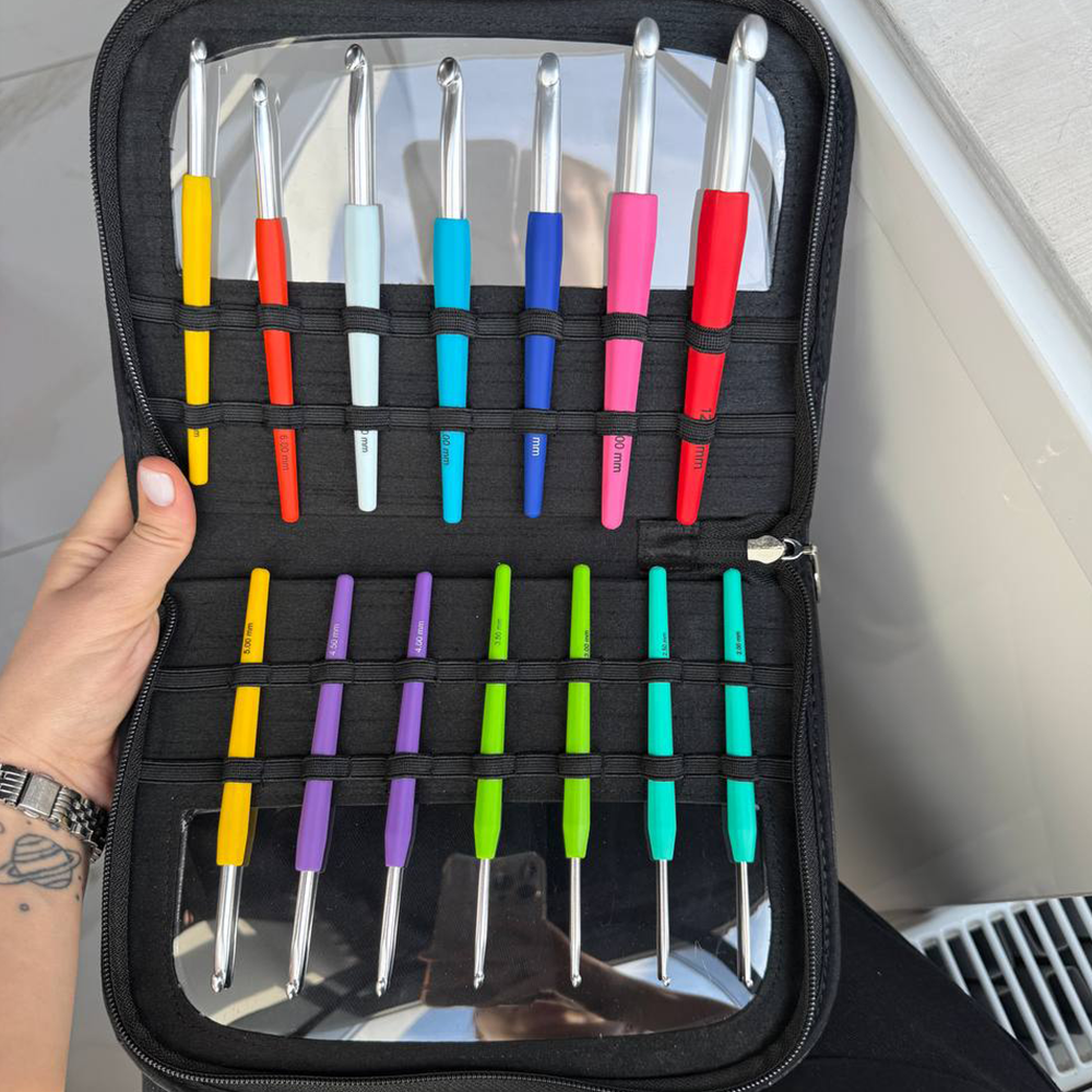 Каждый цвет ручки соответствует определённому размеру крючка, что упрощает их идентификацию. В набор входят крючки размером от 2,0 мм до 12,0 мм, а длина каждого крючка варьируется от 14 до 16 см в зависимости от размера.