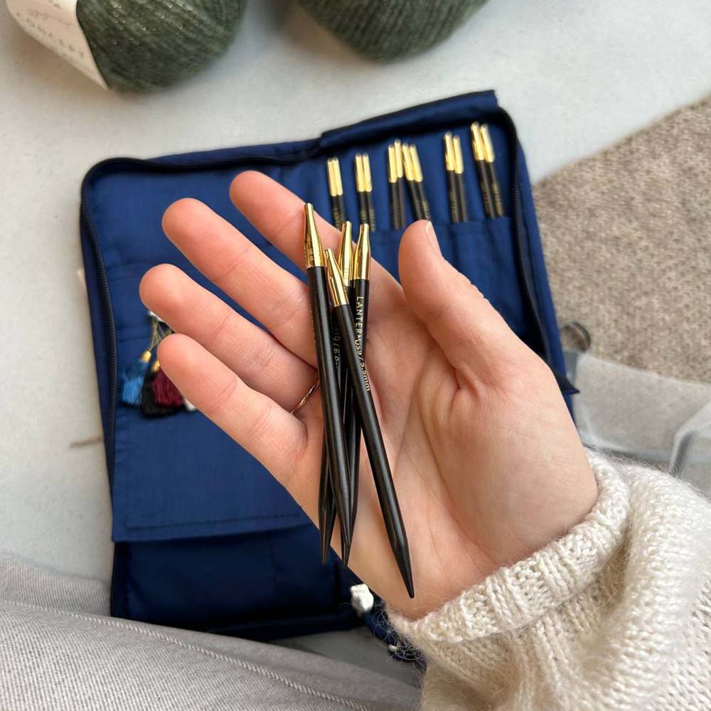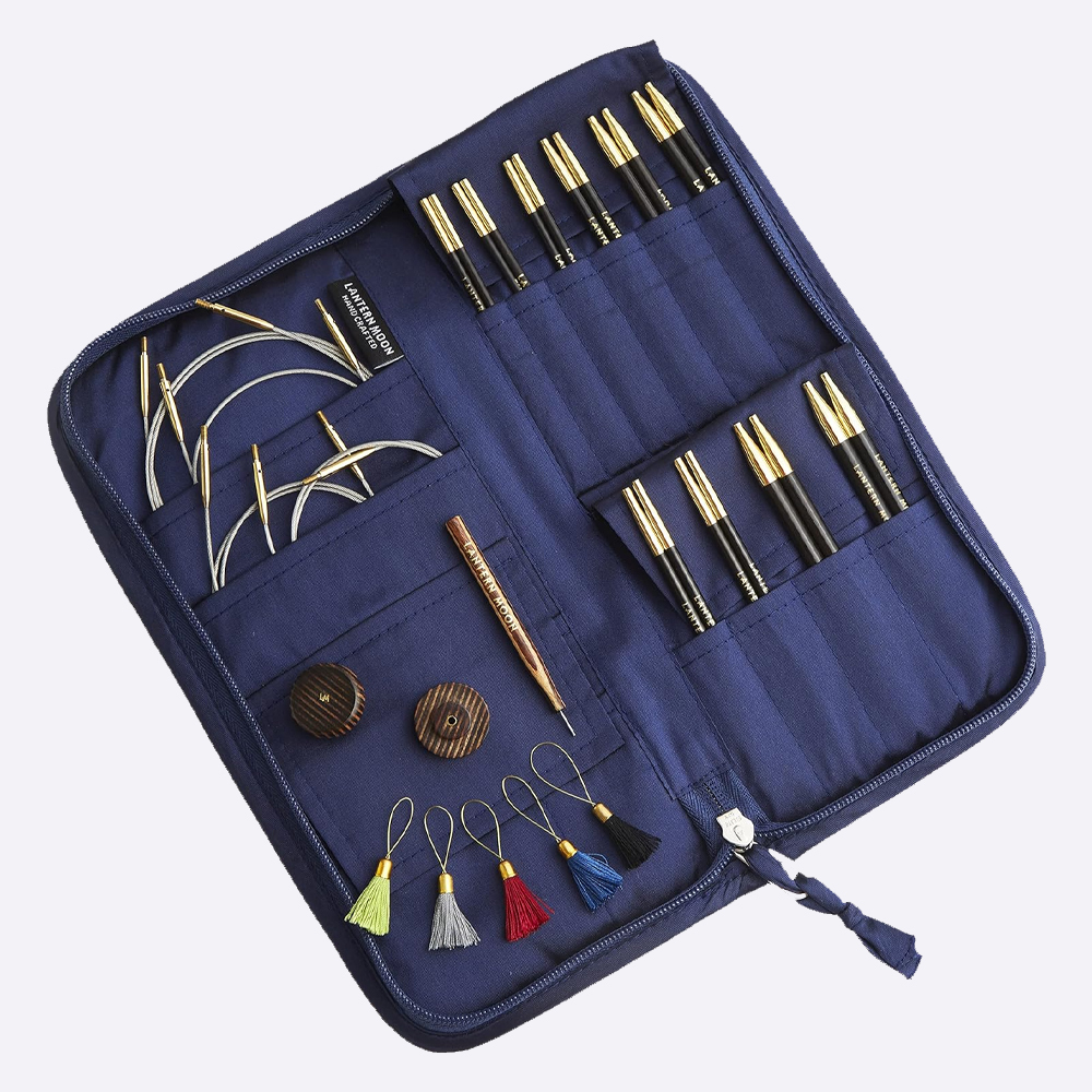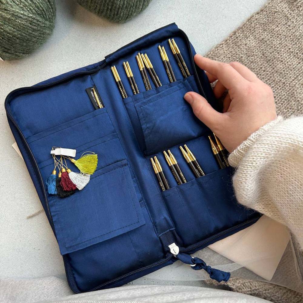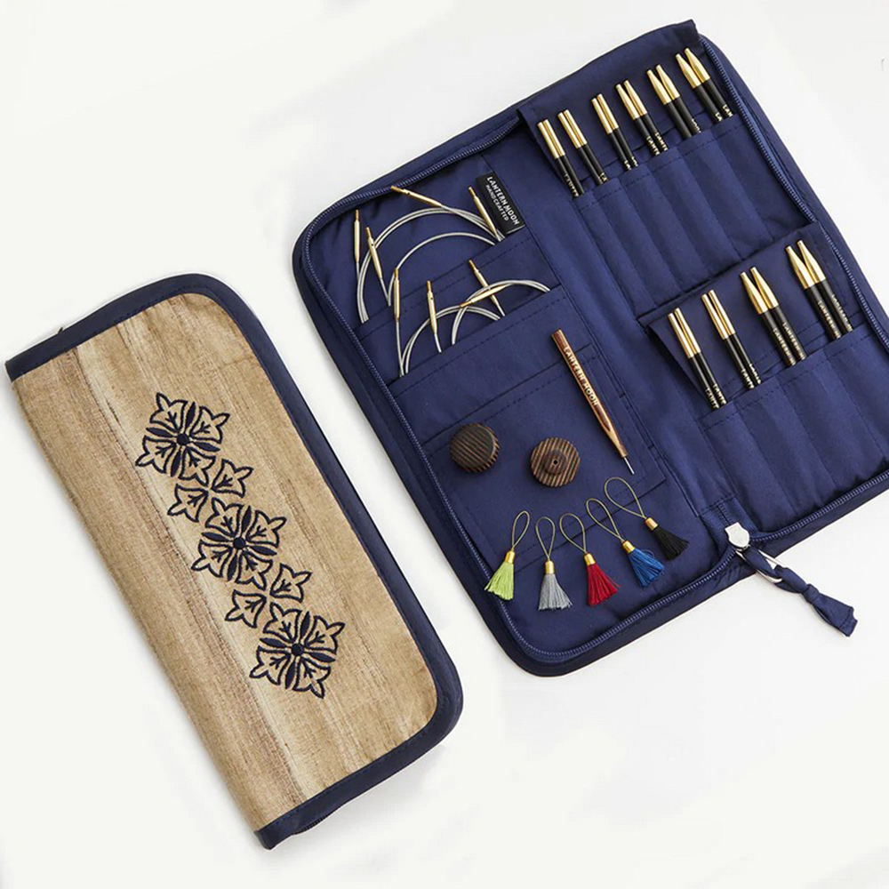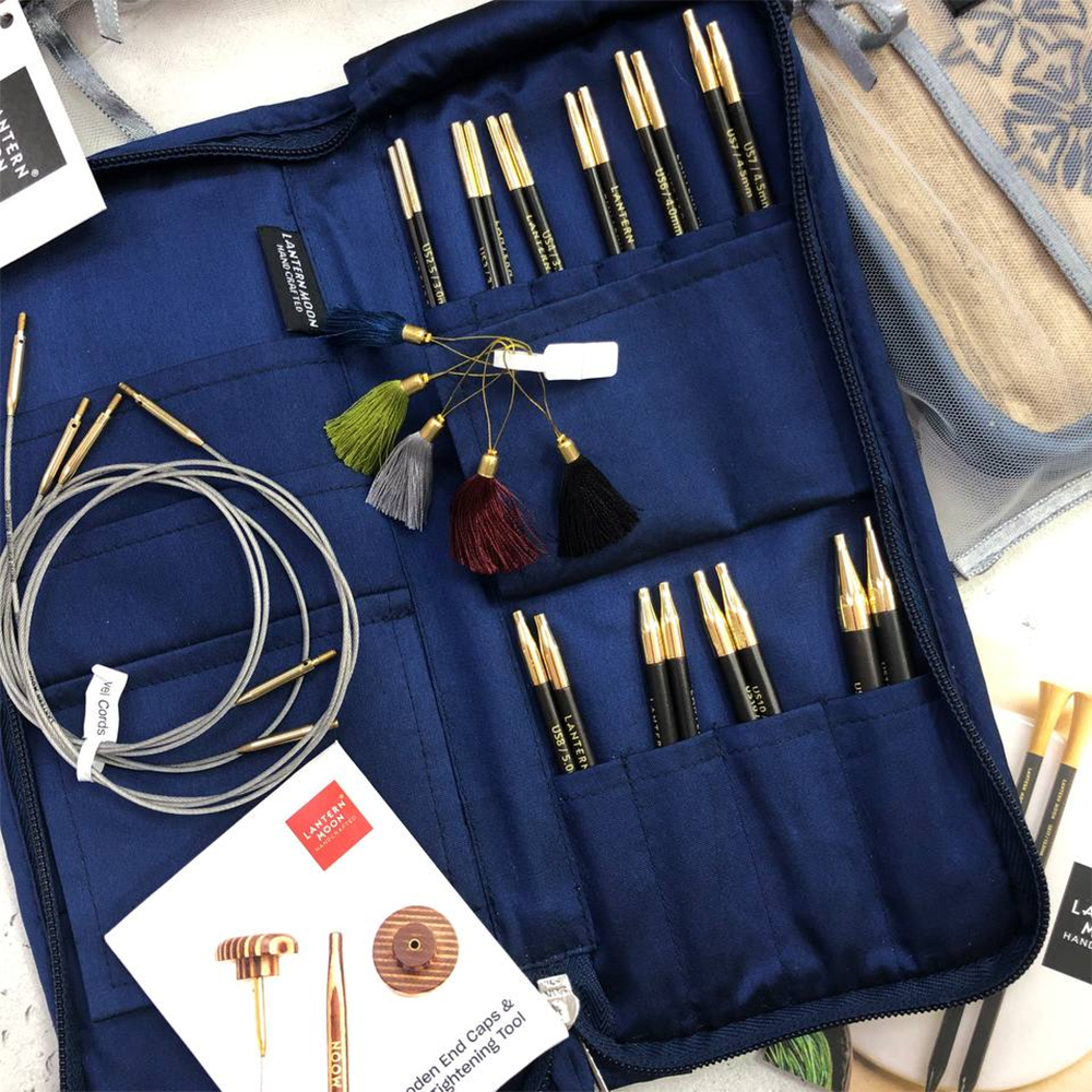 Набор из 20 взаимозаменяемых съемных спиц Heirloom (10 размеров - по 2 спицы каждого размера) упакованы в футляр из шелка кхади.