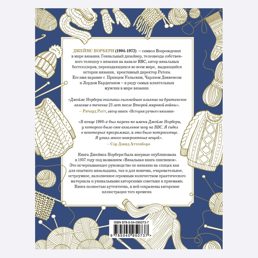 Имя Джеймса Норбери стоит в одном ряду с именами принца Уэлльского Эдварда VIII, Чарльза Диккенса и лорда Кардигана - самых влиятельных мужчин в истории мирового вязания. Блестящий писатель, историк вязания, звезда телешоу о вязании на канале ВВС, креативный директор PANTONS, остроумнейший человек. В своей основополагающей книге он делится своим вязальным опытом и предлагает читателю отправиться в увлекательное путешествие от самых азов до создания полного гардероба на всю семью!
