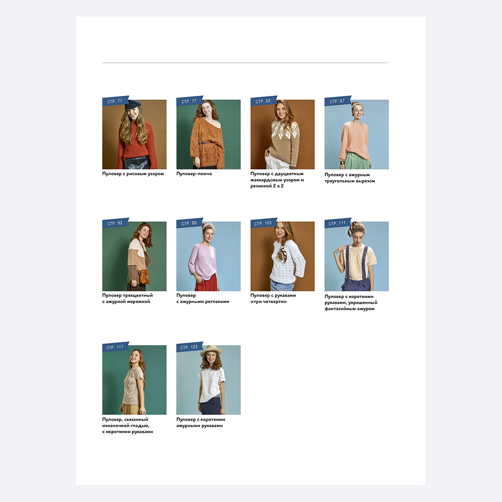 Фактурные узоры, кокетка-лопапейса, ажуры и жаккард — разнообразие отделок буквально поражает воображение. Каждая модель сопровождается пошаговым описанием, схемой и красочными студийными фотографиями.