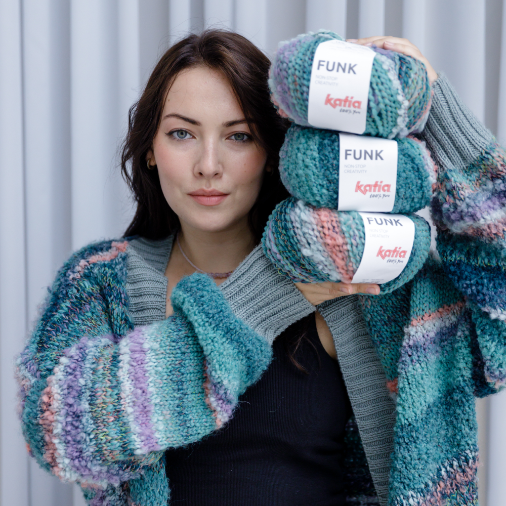 - Пряжа Katia Funk (7% альпака,15% меринос, 68% акрил, 10% ПА, 170 м /100 г) – 5/5/6/6/7 мотков