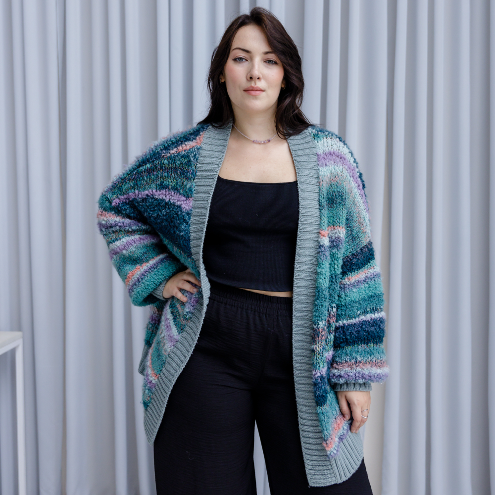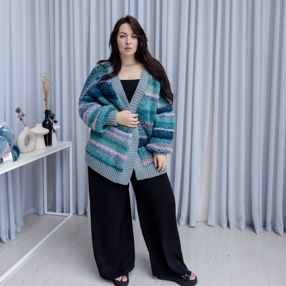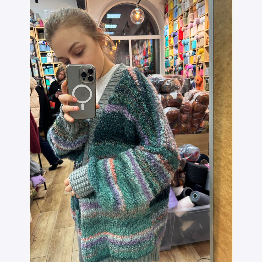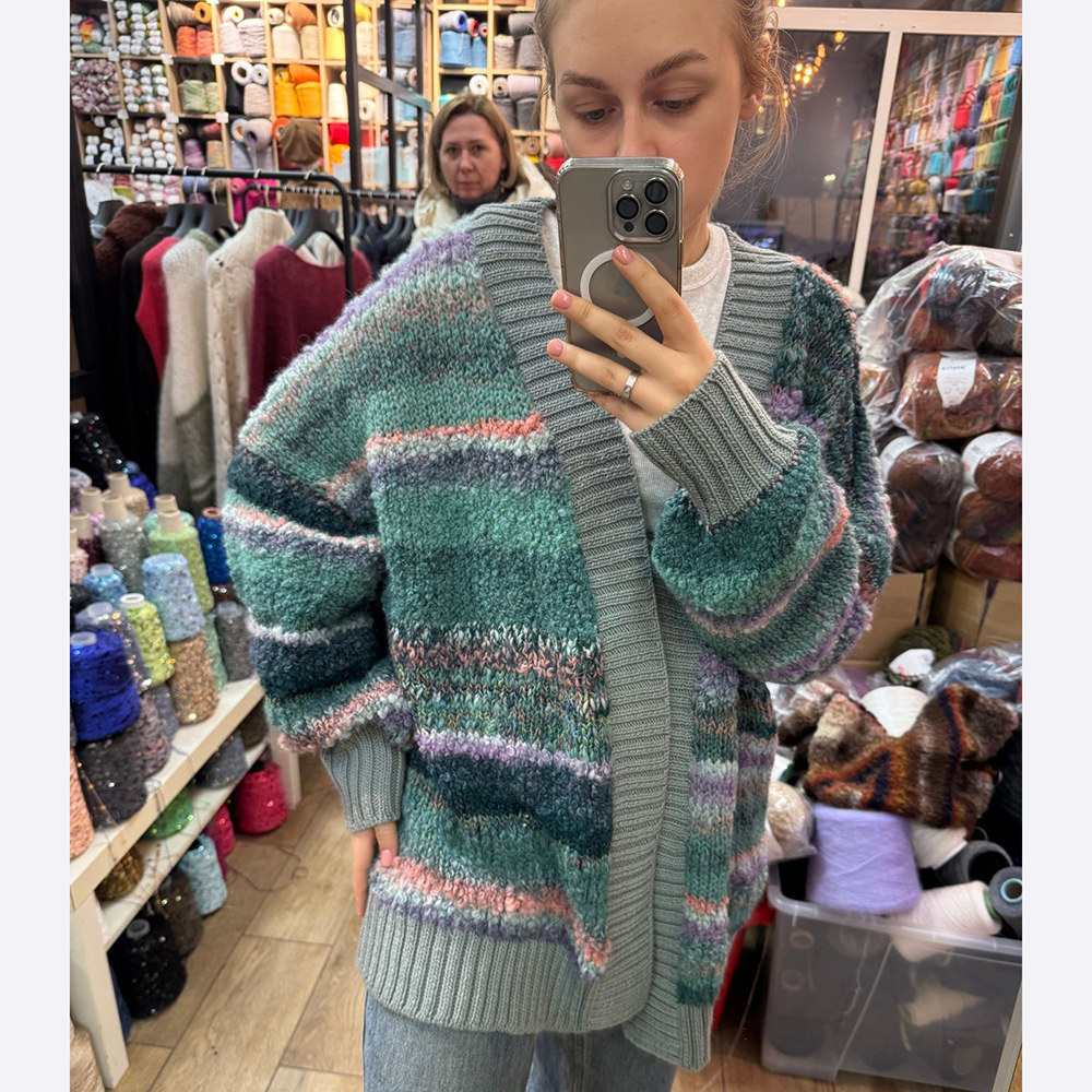- Планки кардигана для контрастности выполнены из однотонной нити