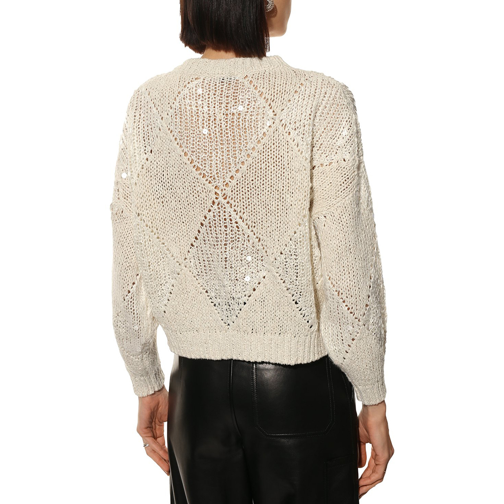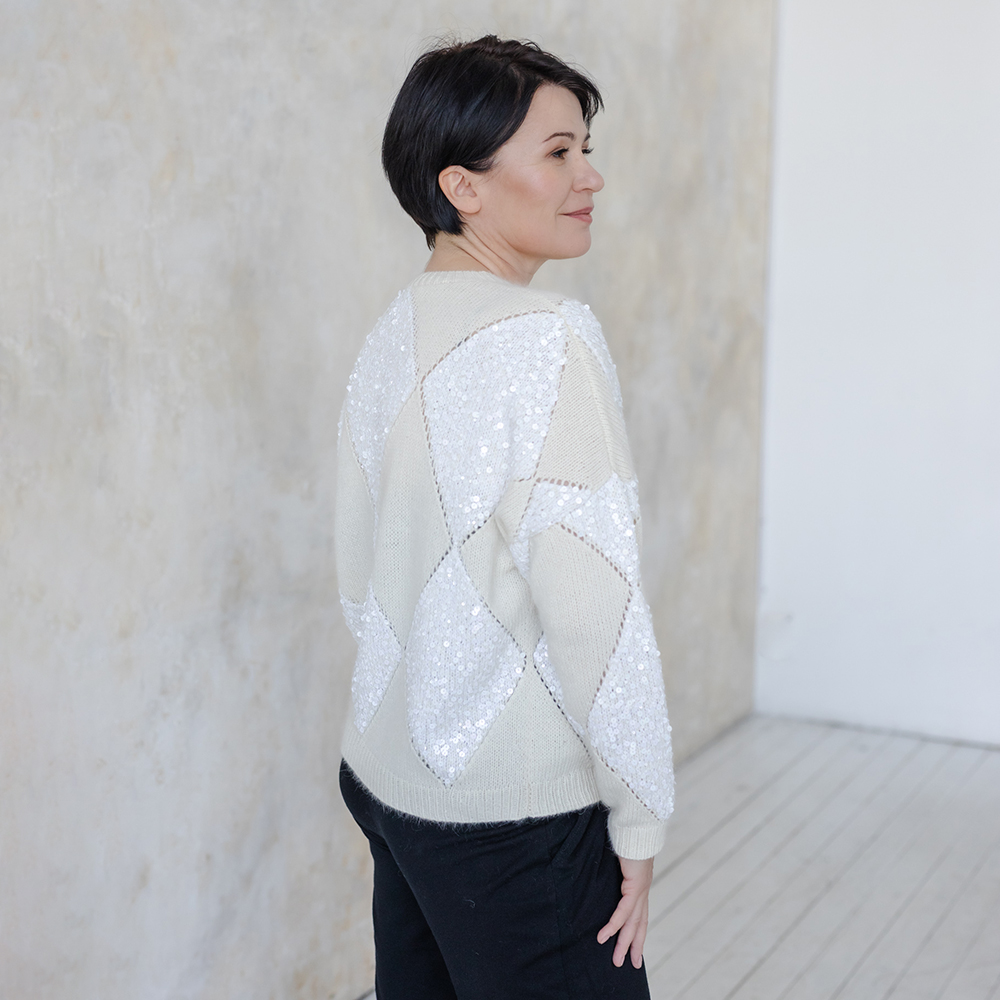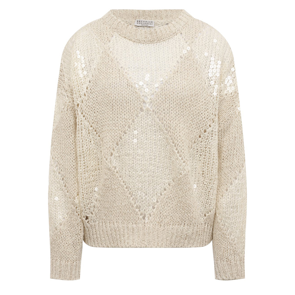 Джемпер связан по мотивам великого маэстро Брунелло Кучинелли. Основной рисунок ромбы, формируемые при помощи убавок и прибавок.