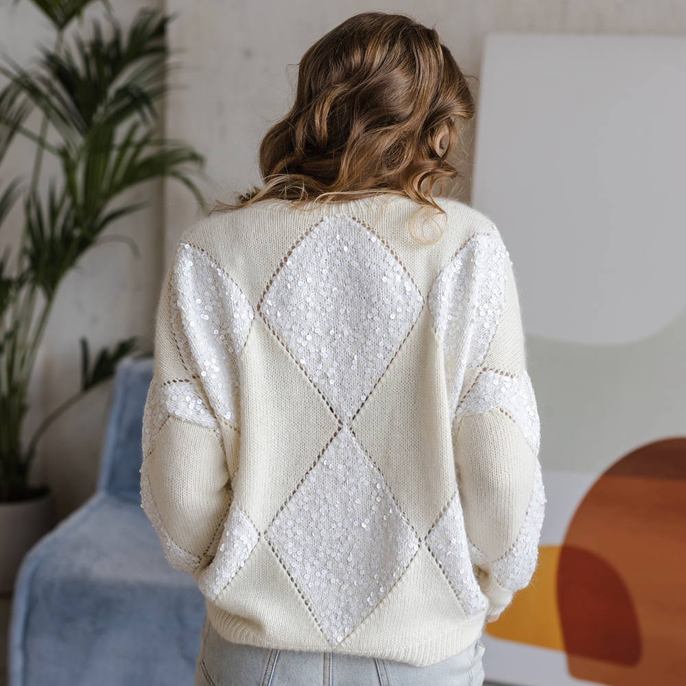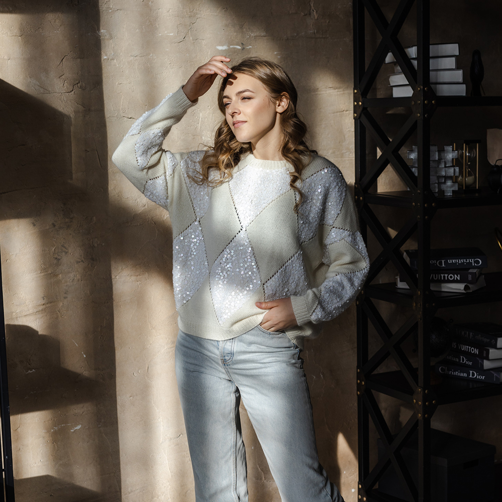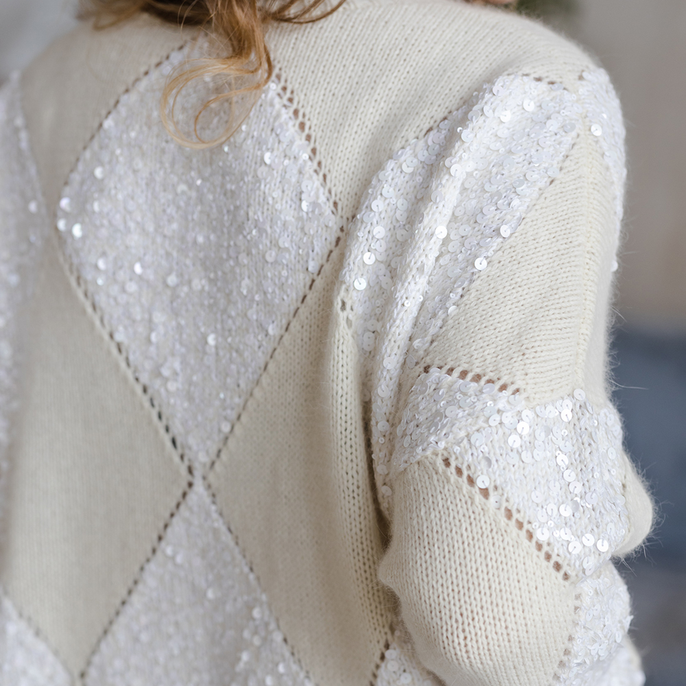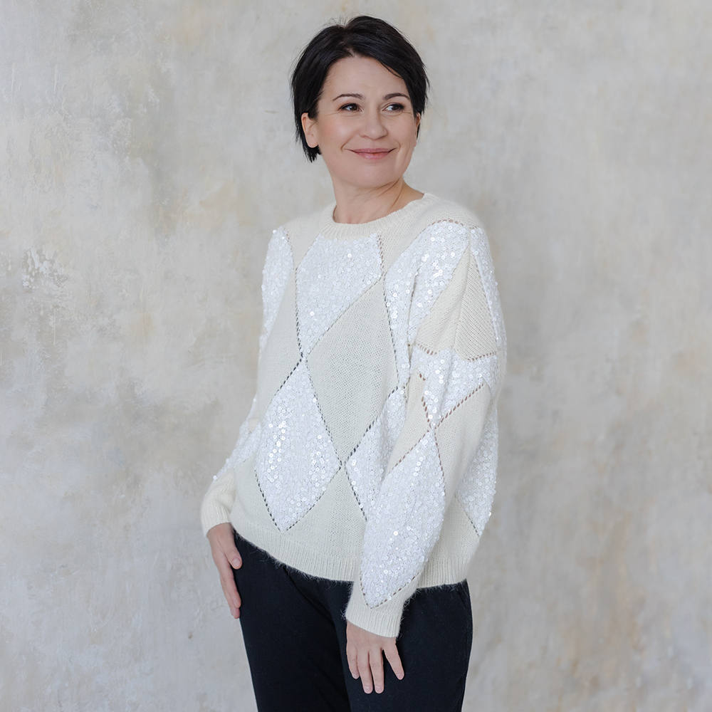 Джемпер связан по мотивам великого маэстро Брунелло Кучинелли. Основной рисунок ромбы, формируемые при помощи убавок и прибавок.
