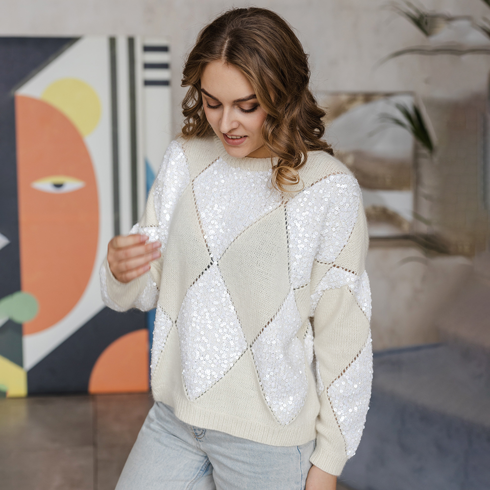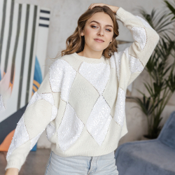 Пуловер вяжется снизу вверх двумя полотнами, отдельно полочка и отдельно спинка. В плечах вывязывается скос. Петли рукава набираются непосредственно от полотна, после сшивания плечевых швов. Обвязка горловины производится по кругу. Обвязка горловины, резинка по низу изделия и манжет рукава связаны резинкой 1/1.