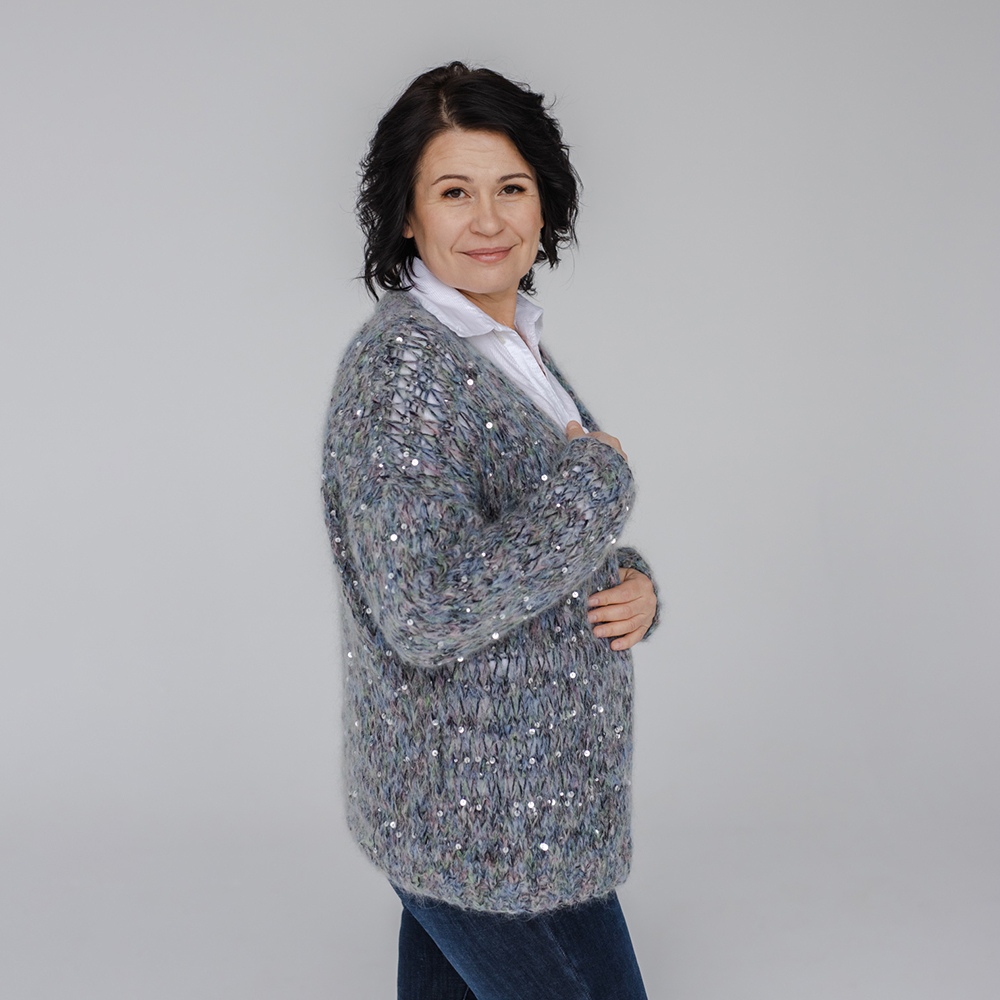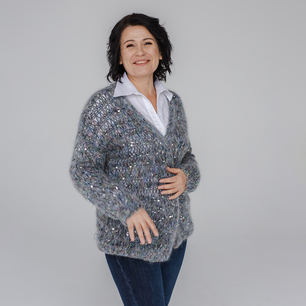 - Рукава вяжутся поворотными рядами, начиная от проймы сверху вниз. Для сужения к низу выполняются убавки по внутренней линии рукава.