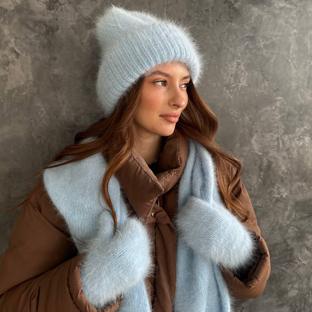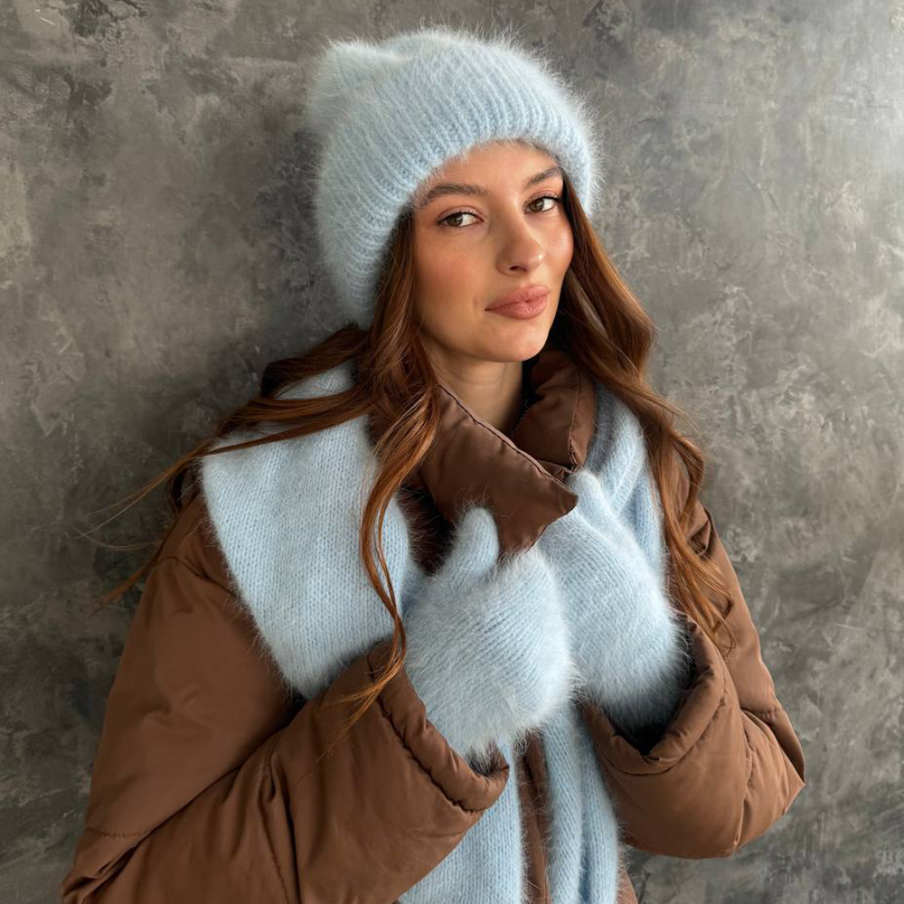 Шапка: 54-58 р-р, высота 41 см, ширина 26 см, Варежки: 18-20 р-р, Косынка: 180 х 100 х 56 см
