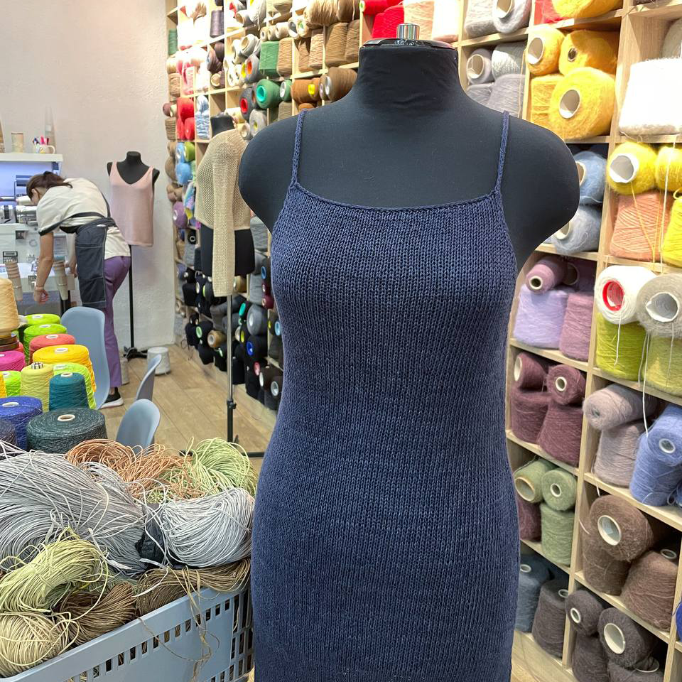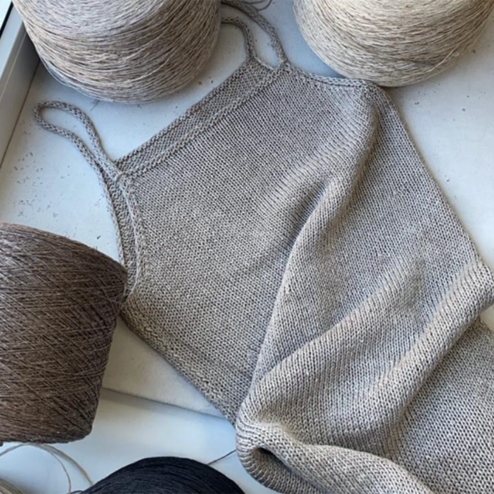 Сшивное изделие: перед и спинка вяжутся отдельными деталями, затем сшиваются по боковым линиям, бретели цельновязаные.