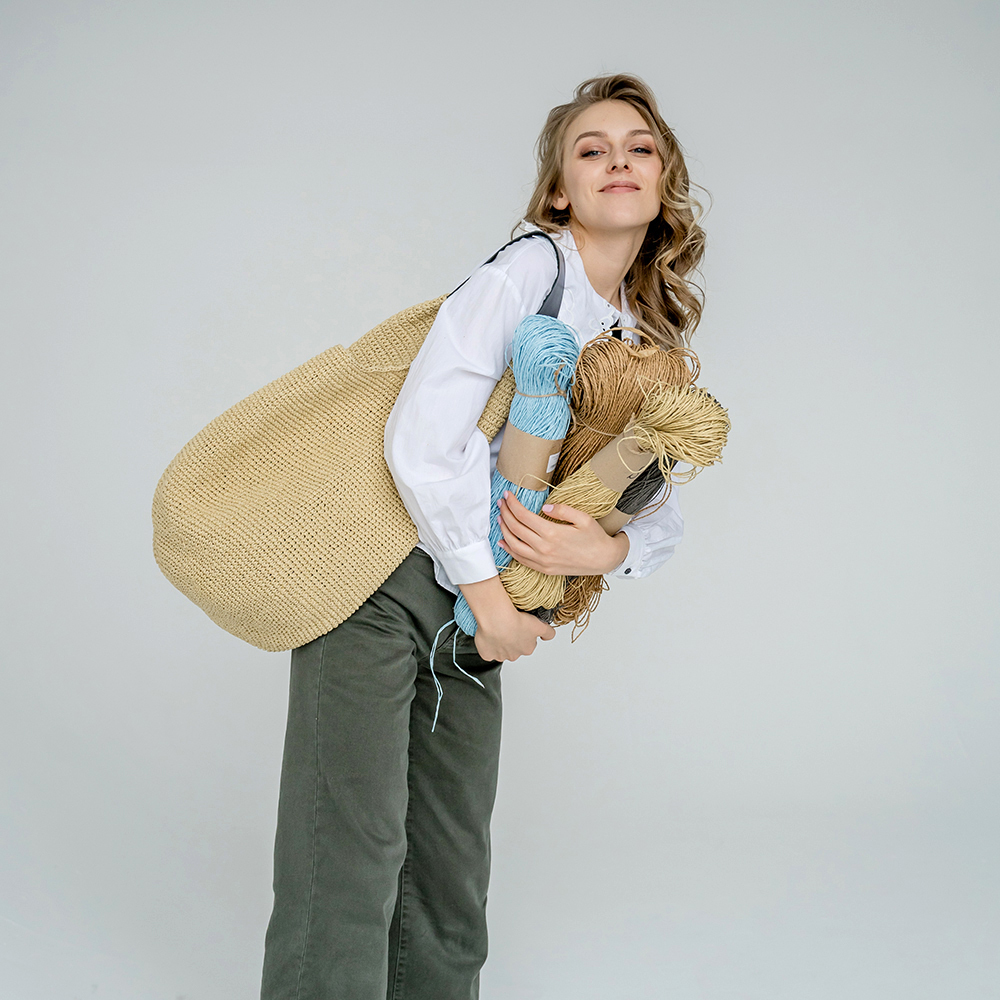 - Пряжа Рафия в пасме Рафаель (НА ВЕС) (волокно 100% пальмы 175 м/100 г) – 400-500 г;