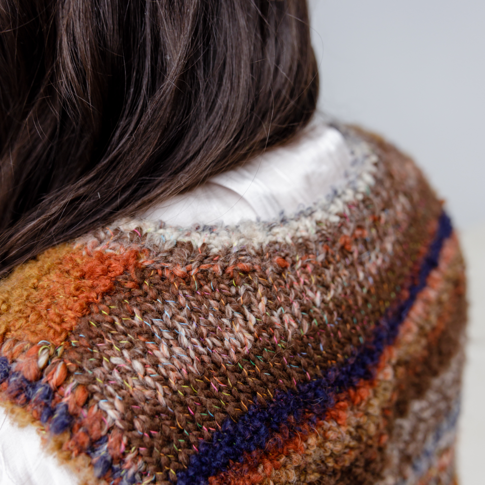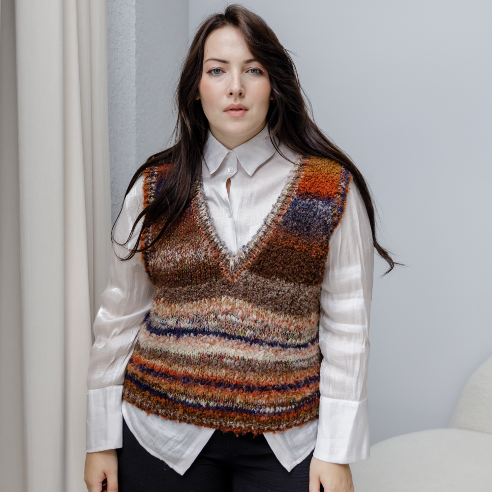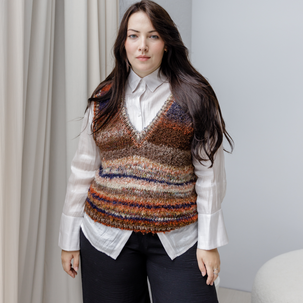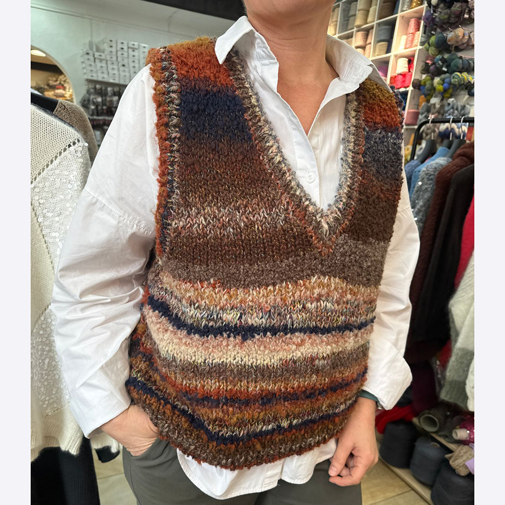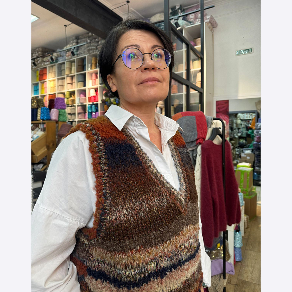Пряжа с разной фактурой делает простую модель интересной и фантазийной. Предусмотрена достаточная свобода облегания на каждый размер.