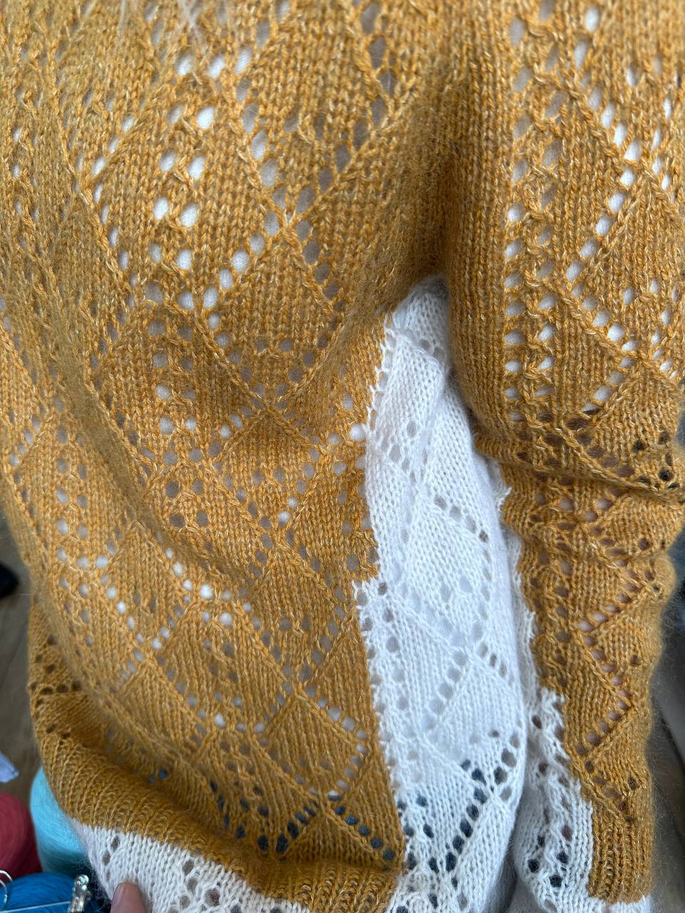 Не менее эффектно пряжа выглядит в лицевой глади, благодаря сочетанию двух разных ниток в составе. Нежнейший Kid Mohair (Кид Мохер) придает изделию объем и воздушность, а хлопок – плотность и прочность. По отзывам рукодельниц, которые уже приобрели пряжу Katia Mohair Cotton, ворсинки мохера имеют умеренную длину. В полотне они не топорщатся во все стороны, а ложатся ровно и аккуратно.