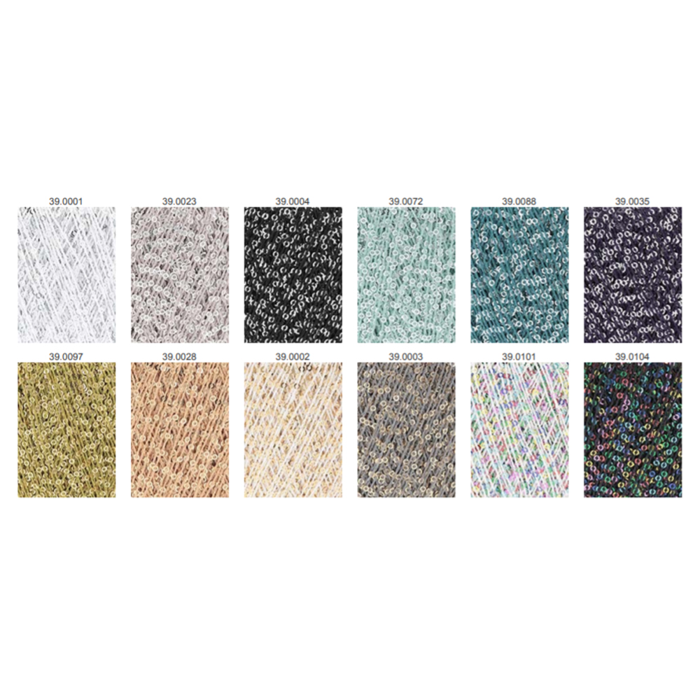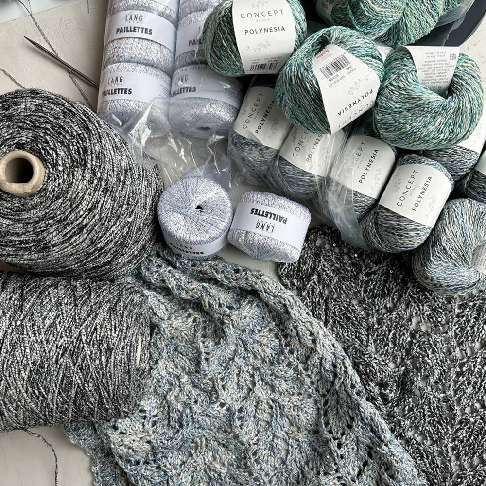 Пайетки маленького диаметра размещены на протяжении всей плотной, но тоненькой полиэстеровой нити достаточно густо, что дает им возможность равномерно распределяться в полотне, не оставляя пустот. К тому же, эту пряжу вязать удобно и приятно. Ее плотность зависит от плотности пряжи, с которой она комбинируется.