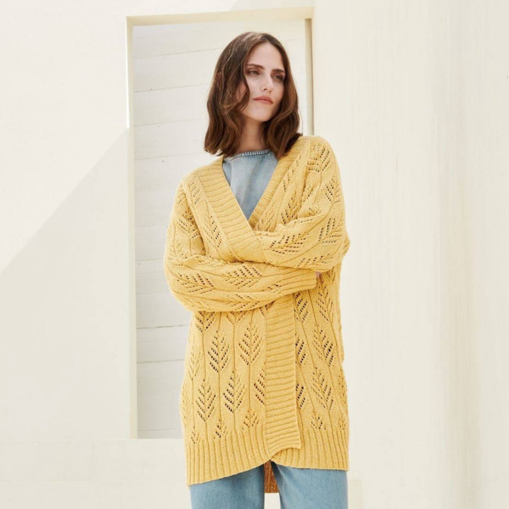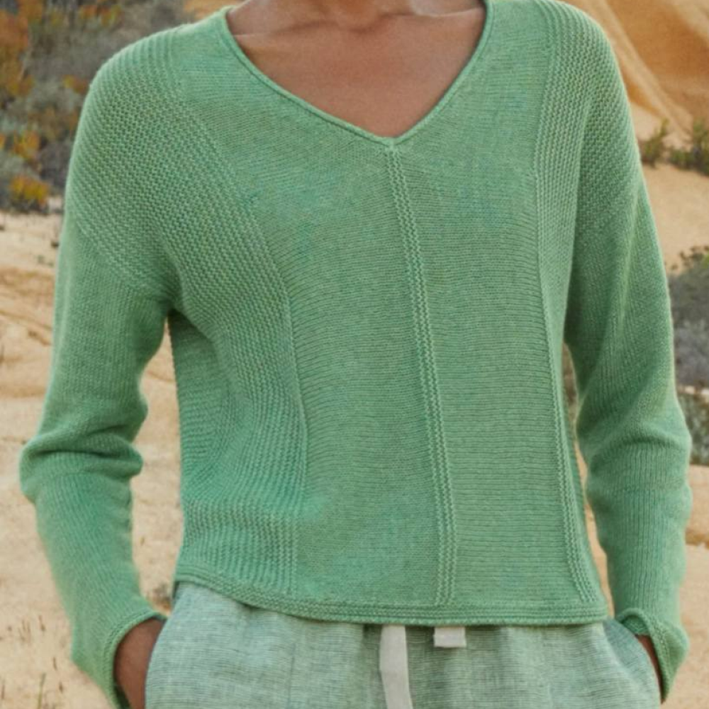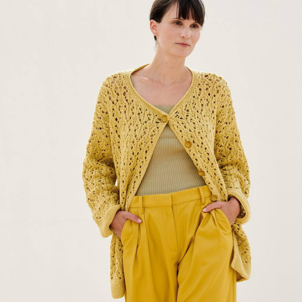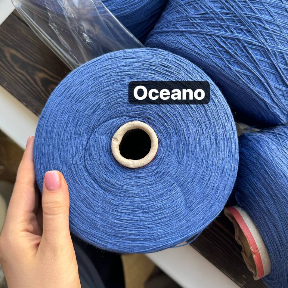 Приятный метраж подходит как для спиц, так и для крючка. Спицами можно вязать в две нити — или добавить подмот, ориентируясь на свои потребности — хотите ли вы усилить льняную или хлопковую составляющую. Для смягчения и украшения рекомендуем кидмохер, кашемир или льняной подмот на шелке с пайеткой.
