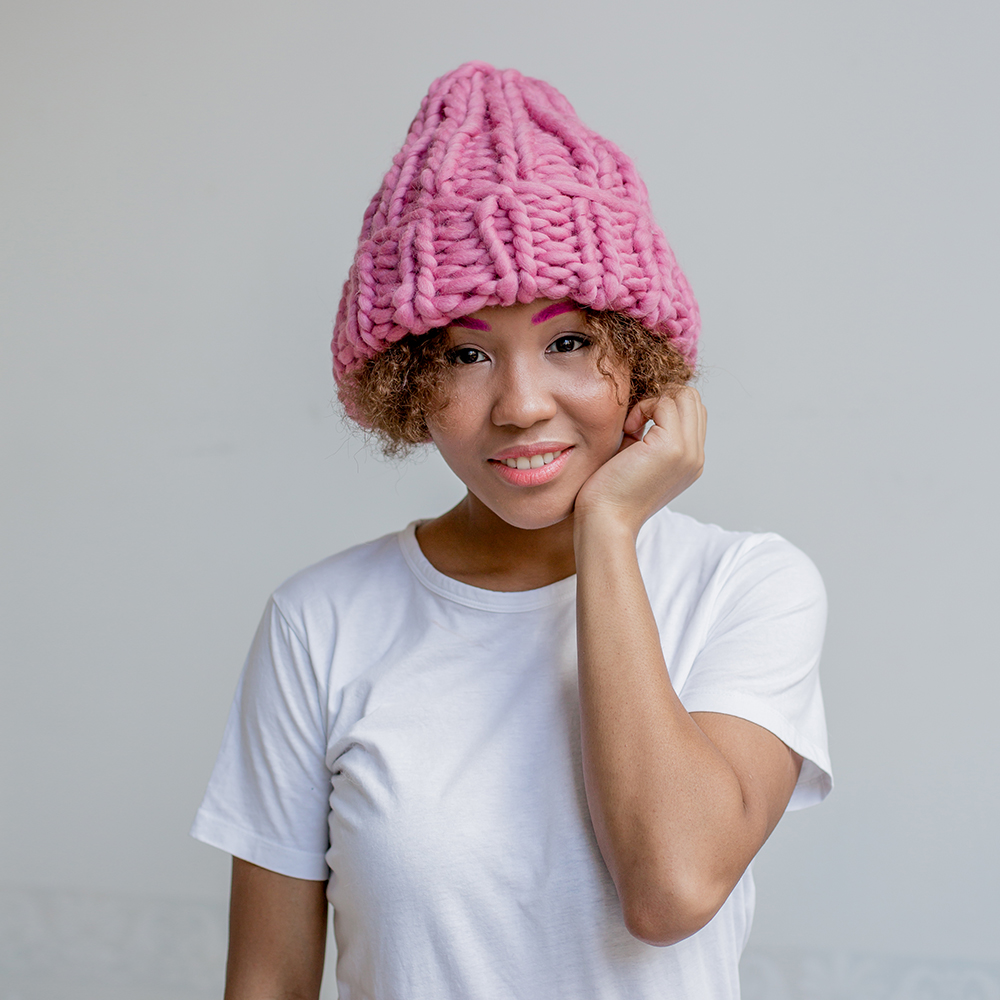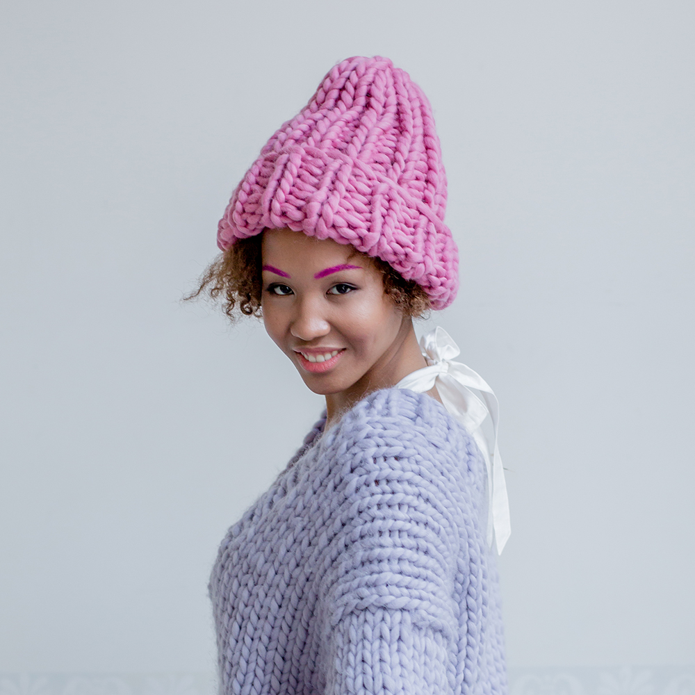 Подойдет для начинающих мастеров вязания. На круговые спицы 15 мм набираем 26 петель, замыкаем в круг и вяжем по кругу резинкой 1 лицевая, 1 изнаночная. Провязав в высоту 24 ряда, делаем убавления в три ряда. Оставшиеся 7 петель стягиваем, кончики прячем и заваливаем иглой для валяния. Модная объемная шапка с отворотом готова)