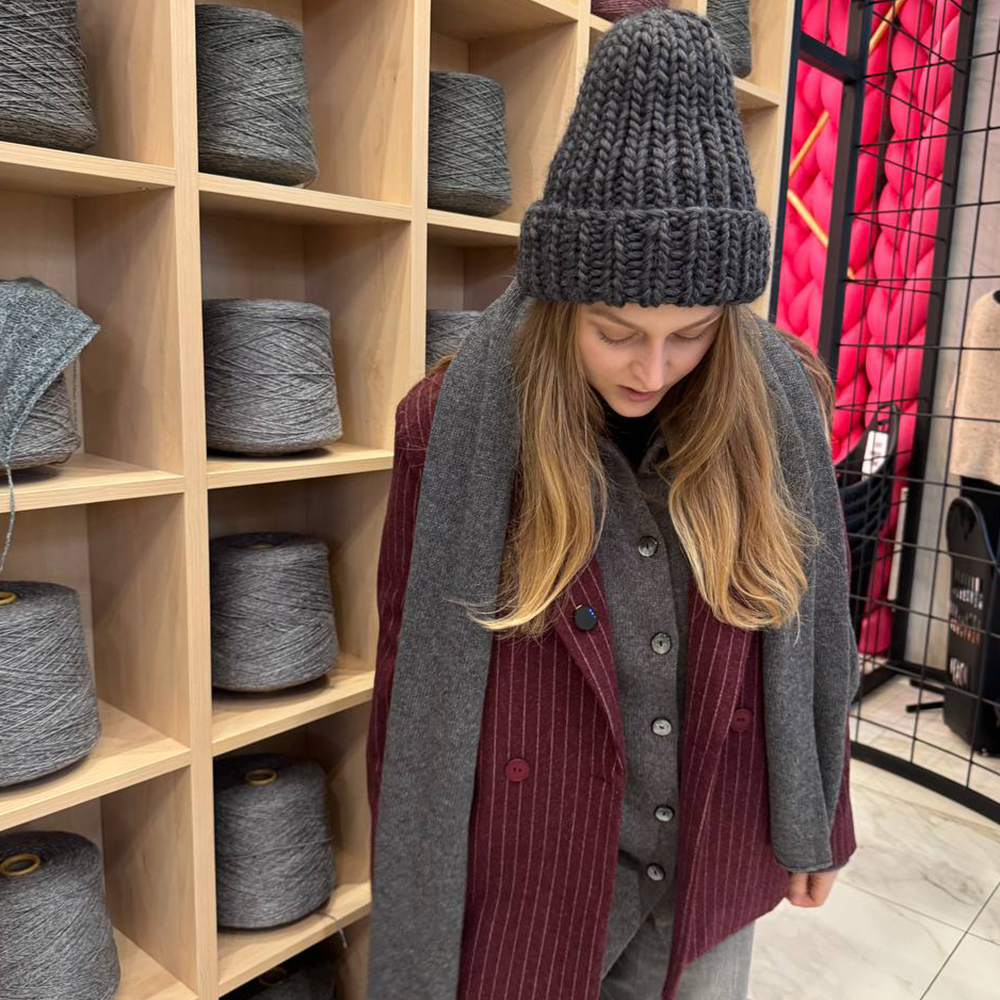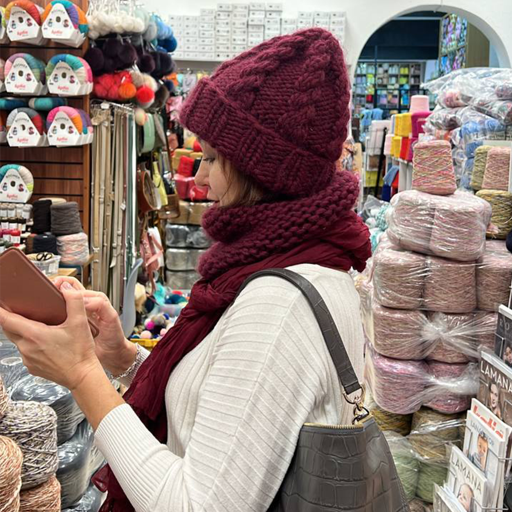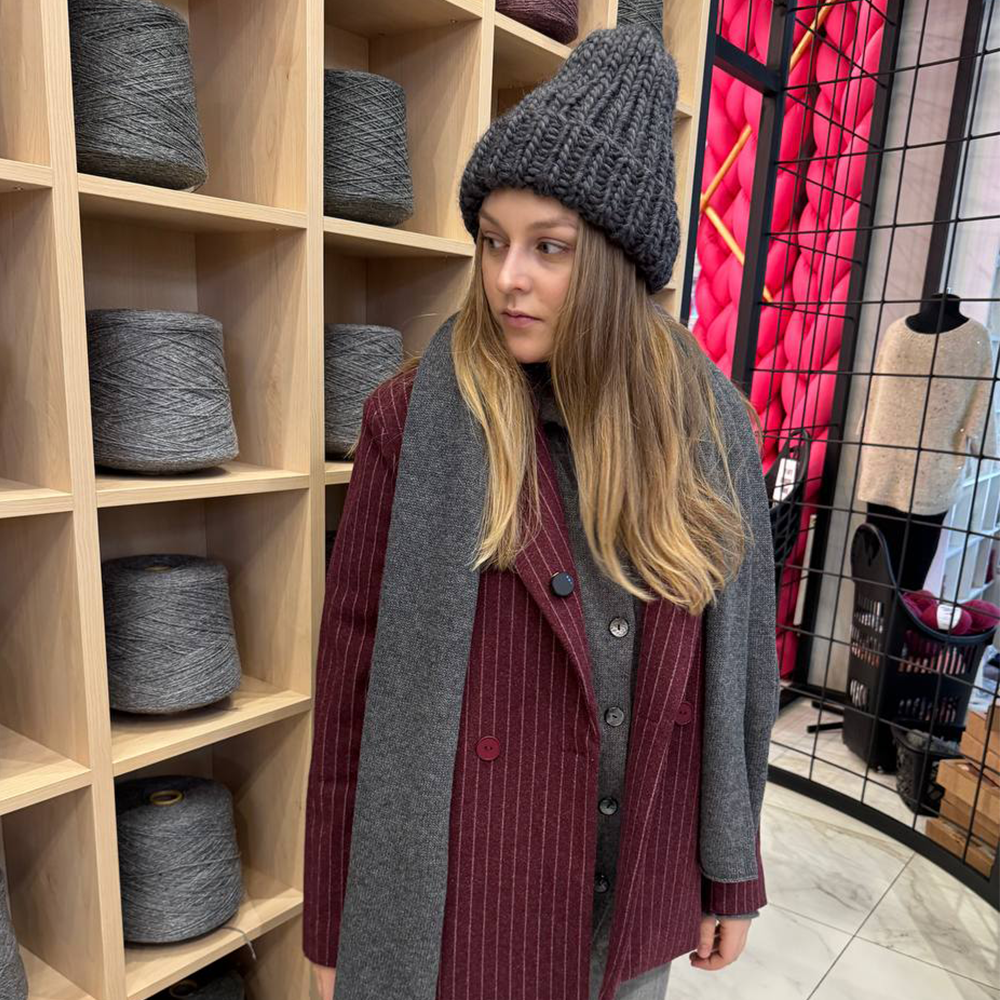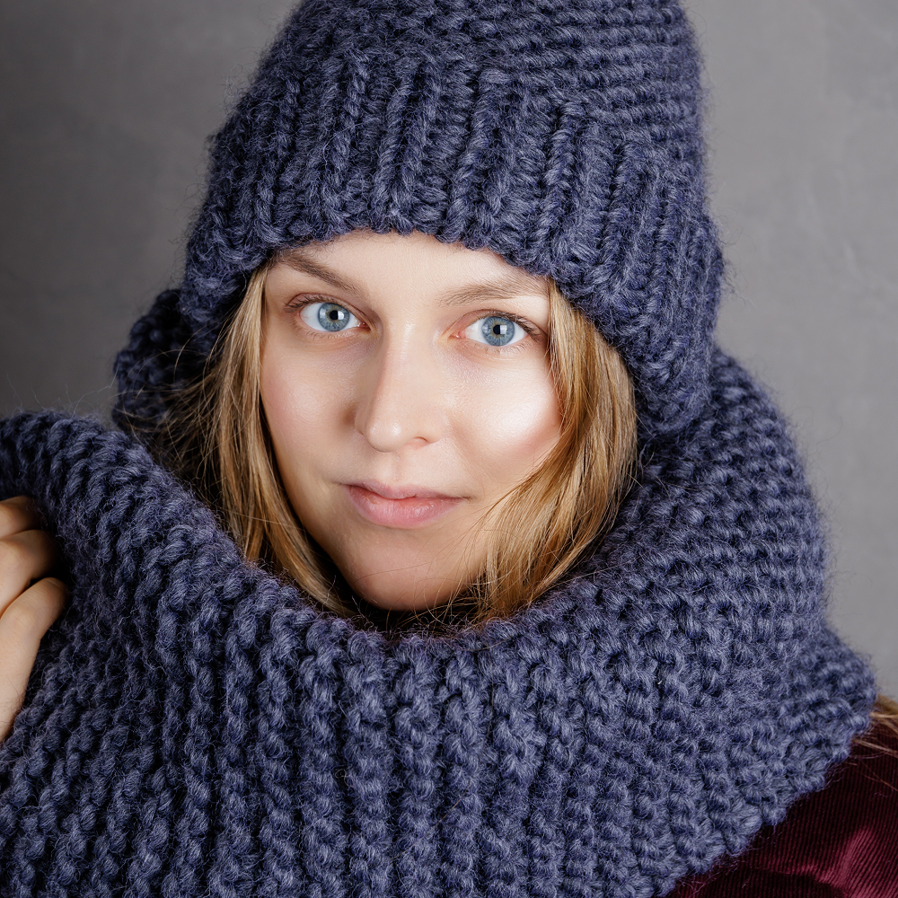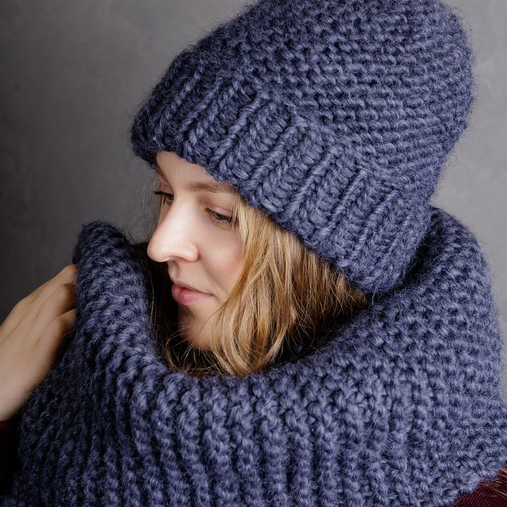 Расход: на шапку с отворотом – 2 мотка, на шарф – 10 мотков, на джемпер 46-48 размера – 10-12 мотков.